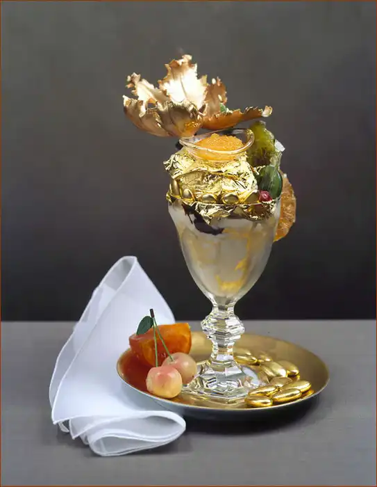 Золотое мороженое – самое дорогое на свете одна порция может стоить $1000! Подается оно лишь в самых элитных ресторанах крупнейших городов США. В стакан с вкуснейшим мороженым кладутся слои золотой фольги толщиной меньше человеческого волоса, редкие фрукты и ягоды. Кушается блюдо вместе с золотой фольгой, которая настолько тонка, что никакого вреда для организма не наносит. Думаю, такое мороженое попробовать никто не откажется.