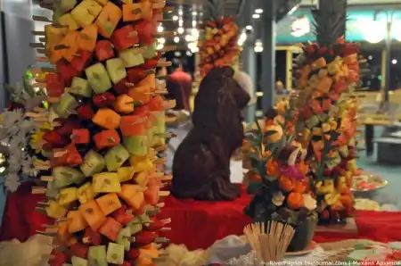 На теплоходе еда - это больше, чем еда. Это одно из развлечений. Можно взять в прокат смокинг (89 долларов за круиз) и вечером за столом, три часа обсуждать события прошедшего дня под смену блюд.