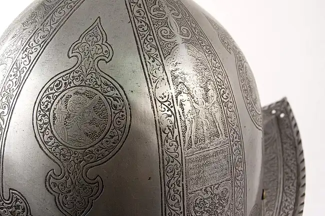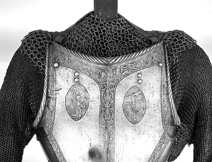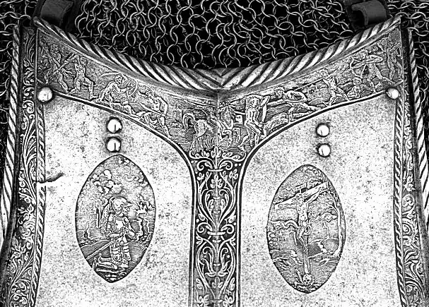 Стальная кираса и тассеты (защита бёдер) украшены искусно вытравленными узорами. На верхней части кирасы изображены батальные сценки, на груди с одной стороны распятие, с другой – коленопреклонённый рыцарь: