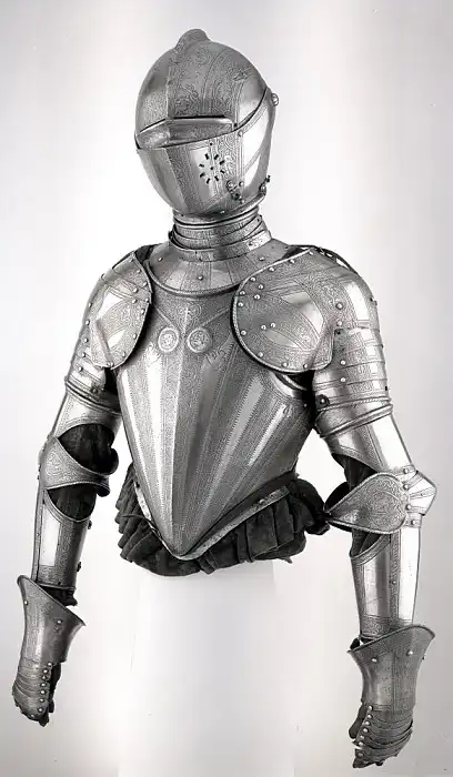 Этот полудоспех состоит из закрытого шлема, ожерелья, панциря и полной защиты рук от наплечников до латных рукавиц. Все части декорированы травленым узором. Панцирь украшен чередующимися косыми полосами, сходящимися в нижней точке. Такого рода декор был впервые отмечен в Германии в 1540-е годы. Позже он стал довольно часто встречаться в Италии. Очевидно, такие полосы – это всё, что осталось от максимилиановского стиля в доспехах.