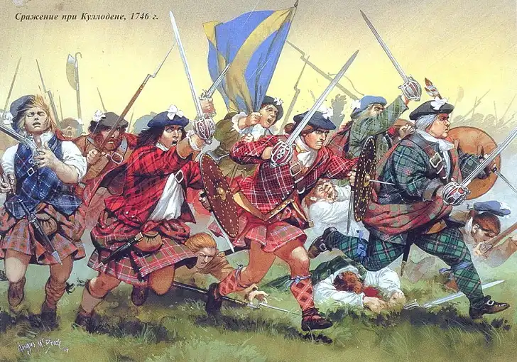 Такой шотландский Claymore с корзинчатой гардой (его ещё часто зовут шотландский палаш) был основным типом меча, который использовался во время якобитских восстаний 18-го века обоими сторонами конфликта. Например, вот такими горцами: