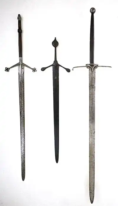 Меч слева – шотландский двуручный меч или Claidheamh dа Laimh, ошибочно называемый Клеймор. Клинок имеет континентальное происхождение, вероятнее всего из Германии. Длинная рукоять сделана в Шотландии в 1550–1600 гг., и имеет форму гарды, типичную для Highland great swords этого периода.