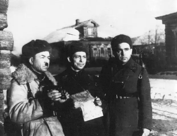 Командир 316-й гвардейской стрелковой дивизии генерал-майор Панфилов И.В. (слева), начальник штаба Серебряков И.И. и старший батальонный комиссар Егоров С.А. обсуждают план боевых действий.