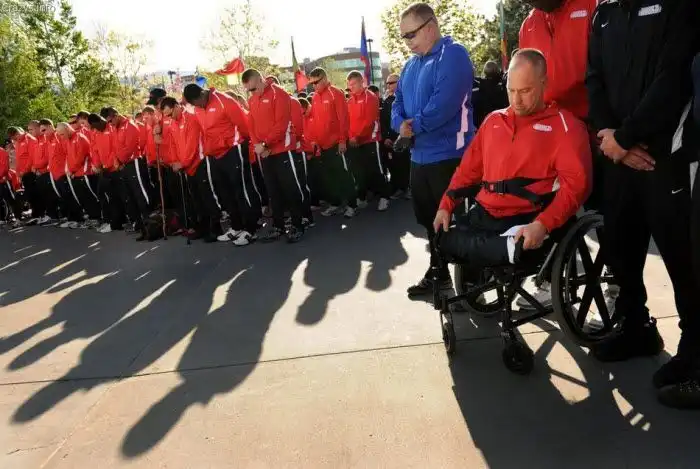 Минута молчания… Чак Скетч вместе с товарищами склоняет голову…Он потерял зрение из-за опухоли мозга, будучи морским пехотинцем. Затем, из-за тромбов, он лишился ног…