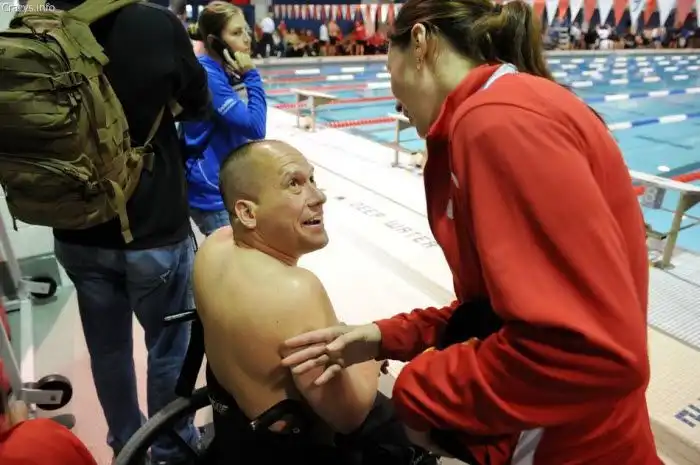 Солдат Гэвин Сибайен поздравляет морского пехотинца Джеймса Кребса в победе на дистанции 100 метров вольным стилем.