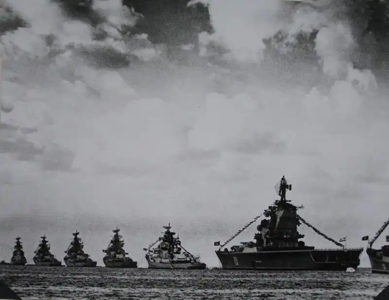 Севастопольская бухта. Вертолётоносец "Москва" уже горел, но ещё крепок. Продажа его на слом за границу может присниться только в кошмаре.