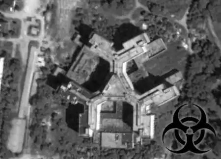 Главный корпус по форме напоминает звездочку или, скорее, знак biohazard (знак биологической опасности - прим. автора), поэтому больницу также часто называют "амбреллой" (Umbrella Corporation - вымышленная фармацевтическая компания, занимающаяся исследованиями в области генетики и биоинженерии из серии игр, а позднее, фильмов, Resident Evil - Обитель Зла).