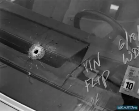 Пулевое отверстие в лобовом стекле автомобиля.