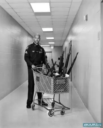 везет в тележке оружие, конфискованное на улицах и в домах жителей Мемфиса.