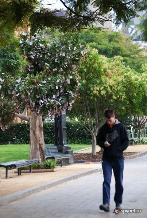 Забавная акция одного австралийского банка. Дерево было украшено 5-ти долларовыми купюрами. Задача — посмотреть реакцию прохожих. Удивительно, но первые 100 человек просто прошли мимо.