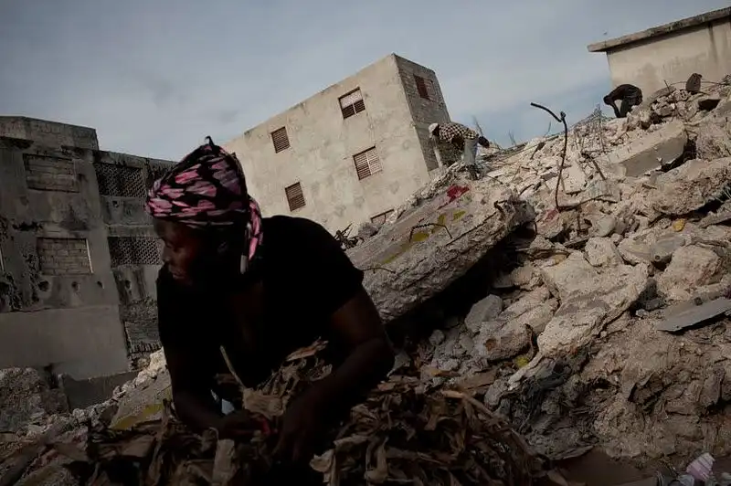 7. Гаитянская девочка несет через развалины большой таз на голове. (Kobi Wolf/ZUMA)