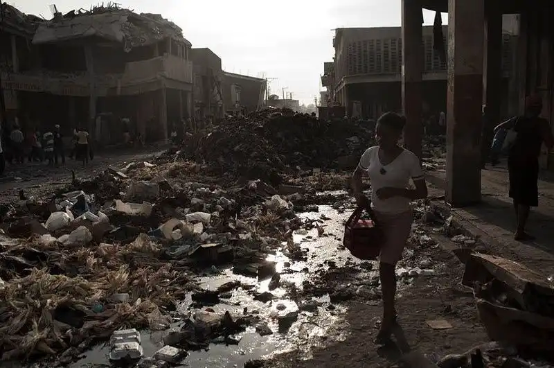 15. Гаитянская девушка идет с корзиной по разрушенной улице. (Kobi Wolf/ZUMA)
