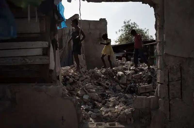17. Гаитянские девочки осторожно идут по развалинам. (Kobi Wolf/ZUMA)