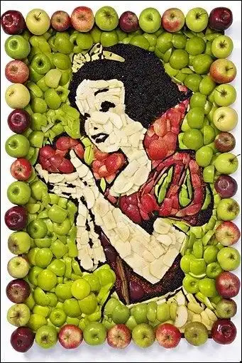 Белоснежка из яблок Образ Диснеевской Белоснежки из мультфильма "Белоснежка и семь гномов" знаком даже тому, кто этот мультфильм не смотрел. Не много не мало шесть сцен из знаменитого мультфильма были воссозданы художницей Пруденс Стэйт, которая специализируется в фуд-арте, т.е. создает картины из еды. Для белоснежки художница выбрала яблоки, причем её понадобилось целых 14 различный сортов яблок.