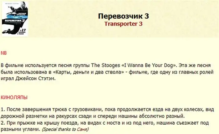 Ляпы ф фильмах: Врата в 3D, На игре, Гарри Поттер и Принц-полукровка, Загадочная история Бенджамина Баттона, Перевозчик 3, Тёмный рыцарь, Пипец, Бешеные псы, Луна 2112, Возмездие.