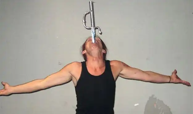 Чтобы острый предмет не полетел глубже и не убил перформера, Скотт тормозит его зубами. Как признается сам артист, делать этот номер всякий раз — абсолютное безумие.