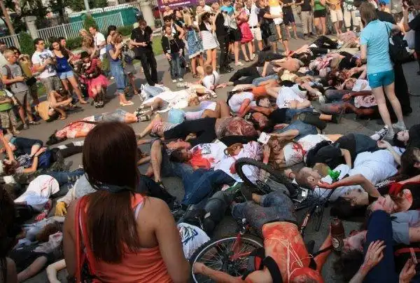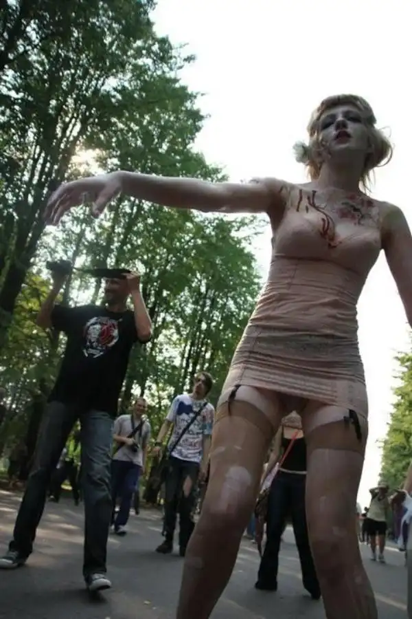 В субботу, 14 августа, в Санкт-Петербурге прошёл второй парад зомби - "ZombieWalk 2: Тёмная Аллея". С обеда на территорию Крестовского острова, к памятнику С.М. Кирову начали стекаться группы молодых людей вооруженных гримом, искусственной кровью и прочей атрибутикой парада. В окрестных кустах постепенно шёл процесс гримировки участников. Все переоблачались в мертвых солдат, монтажников, докторов, репортёров, полицейских... невест, матерей с младенцами, лесорубов, панков.