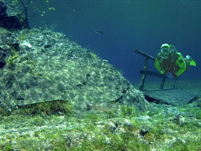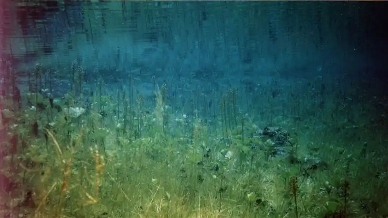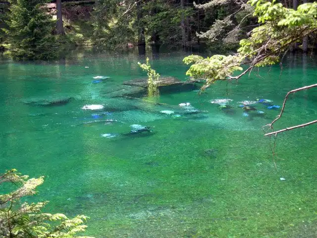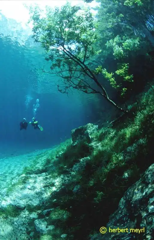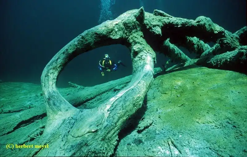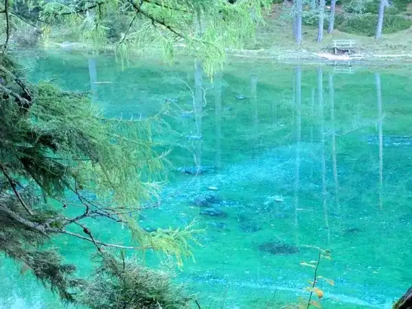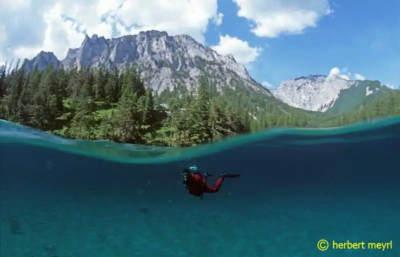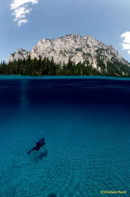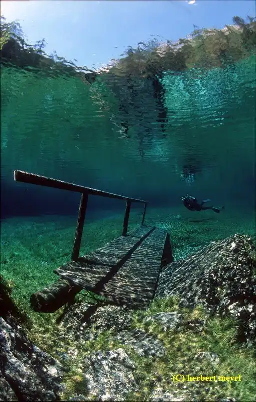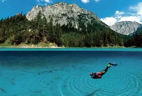 В Австрии есть удивительно место – Gruner See (Зелёное озеро). С августа по апрель - это зелёный парк с тропинками, лавочками, зелёными полянами. Весной уровень воды в озере сильно поднимается из-за талого снега, в среднем на 3-4 метра, затапливая ежегодно тропинки, лужайки, мостики и лавочки. Но при этом видимость сохраняется совершенно волшебная - метров 30, наверное, а то и больше. Именно в это время нужно там оказаться, чтобы своими глазами увидеть кристально чистую пресную воду озера.