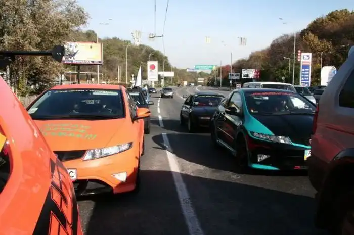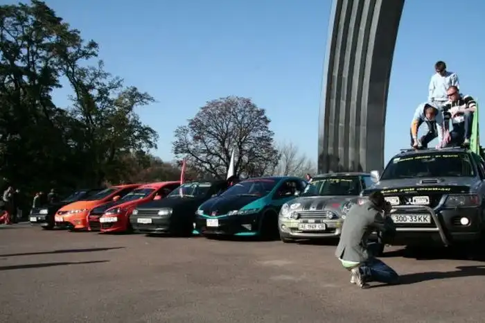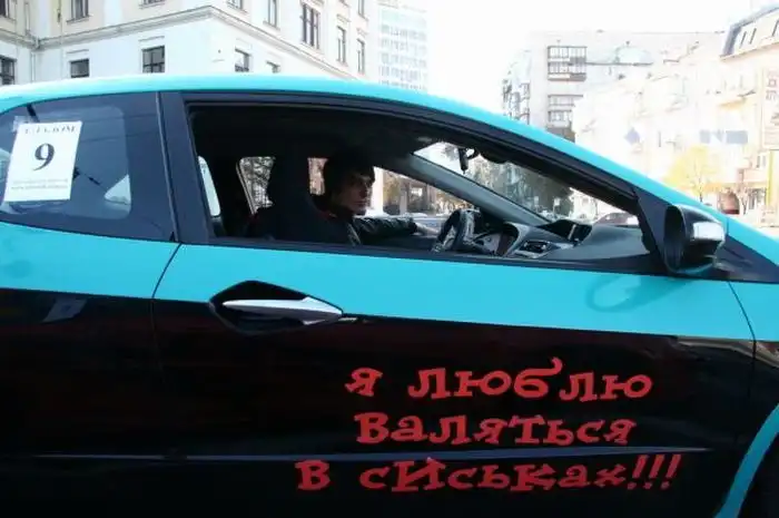 обклеили свои машины соответсвующими наклейками. Улавливаете суть? Мы тоже не сразу поняли. Оказывается, таким образом Форс и Co. хотели показать миру (в лице киевлян и гостей столицы), что сиськи - это хорошо, но только в том случае, когда они красивые и не на авто-сайтах. Снова не понимаешь, о чем речь? В общем, все просто. Порою на форумах, порталах и в социальных авто-сетях можно встретить фотографии девушек (не самых красивых), которые блестают своей "красотой" на фоне не менее уставших и "красивых" ржавых автомобилей (не путать с рэт-луками!). То есть, мажорным сиськам в мажорных тачках - да, а вот дряхлым сиськам в дряхлых тачках - нет!