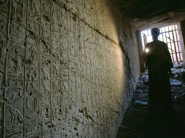 Стены могил египетских фараонов часто были покрыты иероглифами, которые давали инструкции, как пройти к королю, избежав многих опасностей, которые могли поджидать в дороге между адом и раем. Здесь, фонарь человека освещает настенные надписи на пути к могиле Рамзеса второго.