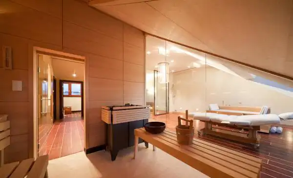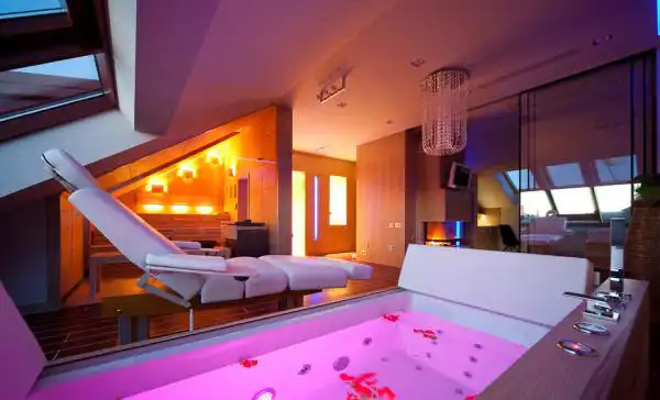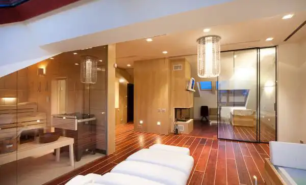 Квартира двухэтажная. Всего 2 спальни, 1 гостиная с кухней, кабинет, сауна и 4 ванные комнаты.