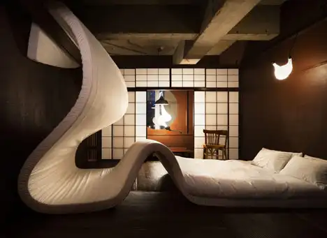 В Токио сейчас проходит выставка LLOVE-2010. Это отель с комнатами, созданными голландскими и японскими дизайнерами, включая Пике Бергмана (Pieke Bergman), который придумал этот огромный холмистый матрац (на фото). Таким образом Голландия и Япония празднуют 400-летие со времени начала торговых и культурных отношений между этими двумя странами. Посетители могут заказать комнату, чтобы переночевать. Концепт выставки разработан Сюзанной Оксенаар (Suzanne Oxenaar), директором Амстердамского отеля Lloyd. Выставка продлится до 23 ноября.