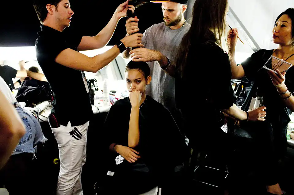 6. Перед началом показа Concept Korea за кулисами царит традиционная суета. Парикмахеры и гримеры сбились с ног. Следующей весной особо актуальной прической будет простой и удобный конский хвост или же можно свернуть волосы в тугой узел.