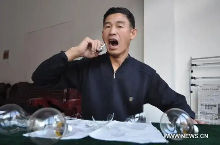 На завтрак стекло, на обед железо, бетон на ужин... За остальное не знаю, но стеклянные лампочки Чжан Юджиян трескает. Китайский каскадер из города Муданьцзян публично слопал 3 штуки. На это у него ушло всего 120 секунд.