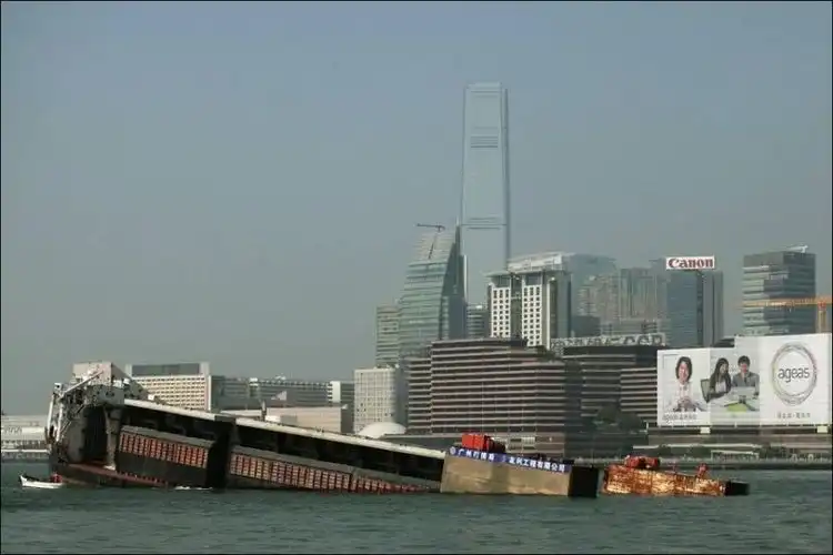 В бухте Виктория, что в Гонконге, терпит крушение баржа, длина которой составляет 121 метр. Как мы можем видеть на фото, оказывать помощь данному судну никто не пытается, а все потому что затопление данной баржи было преднамеренное, для осуществления каких-то невиданных работ.