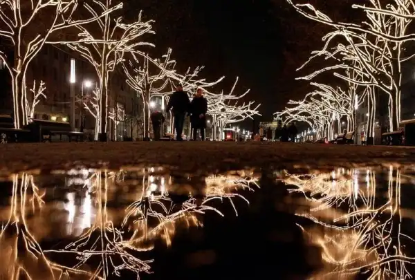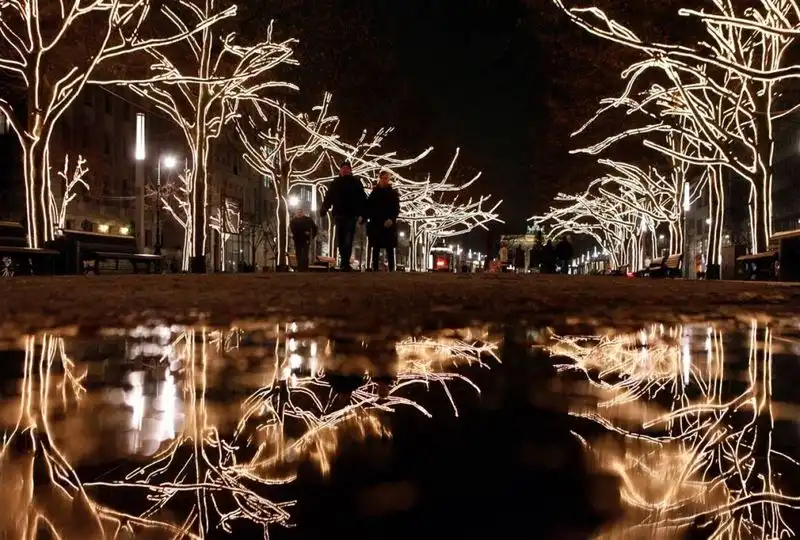 20. Украшенные гирляндами деревья отражаются в луже на улице Унтер-ден-Линден в Берлине.. (Thomas Peter / Reuters)