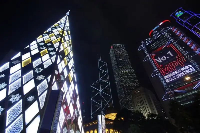 4. 29 ноября в Гонконге зажгли огни на 30-метровой пирамиде из кристаллических блоков на фоне небоскребов в финансовом районе. (Ym Yik / EPA)