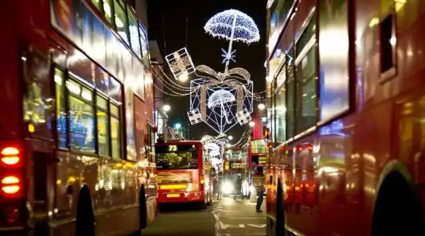 6. Автобусы на залитой огнями улице Оксфорд-Стрит в Лондоне 23 ноября. (Ian Gavan / Getty Images)