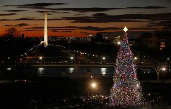 5. 7 декабря люди собрались на церемонию зажжения огней на рождественской елке перед зданием Капитолия США. 20-метровая ель Энгельманна была срублена в национальном заповеднике Бриджер-Титон в Вайоминге. Елку украшают гирлянды из энергосберегающих светодиодных огней и елочные игрушки ручной работы, сделанные жителями Вайоминга. (Chip Somodevilla / Getty Images)