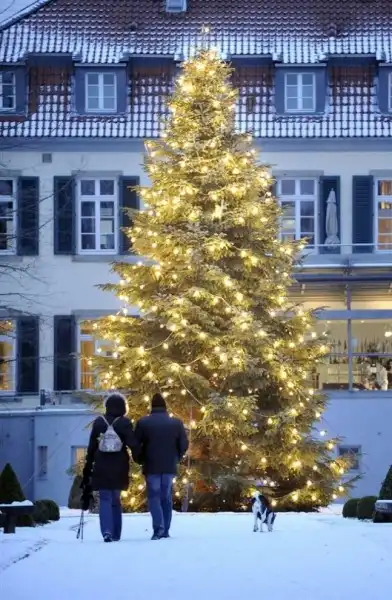 10. Пара гуляет с собакой рядом с украшенной гирляндами ёлкой возле поместья в Гельзенкирхене, на западе Германии. (Martin Meissner / AP)