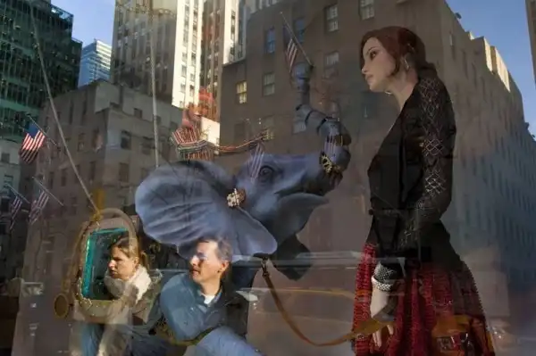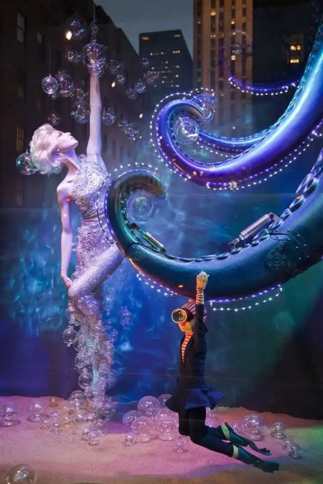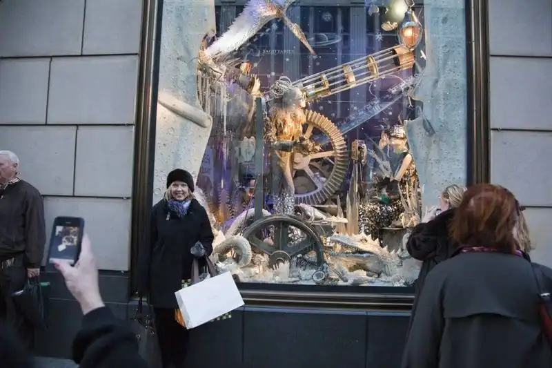 2. Женщина у витрины магазина «Bergdorf Goodman». В этом магазине на Пятой Авеню и 58-ой Стрит витрины выполнены в стиле путешествий в фантастические места и другие планеты и имеют общее название «Хочу, чтобы ты был здесь». Директор отдела витрин магазина Дэвид Хойи говорит, что праздник – это всегда целое попурри прибытий и отправлений, и иногда вдохновение приходит из самых неожиданных мест, например, из фильмов и римской мифологии.