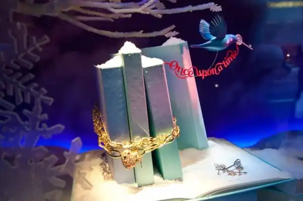 9. Сказочная витрина магазина «Tiffany's» на Пятой Авеню с ожерельем с сердцем и колибри с ключом, инкрустированным драгоценными камнями.