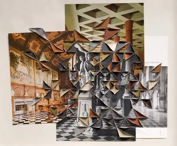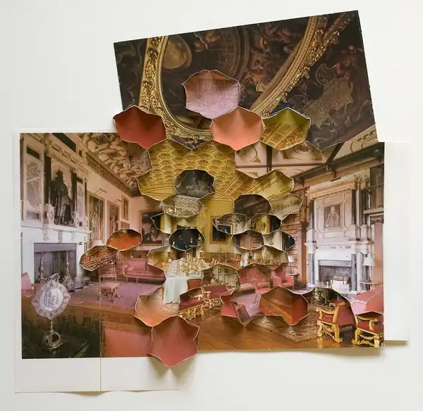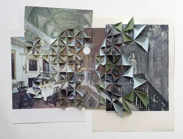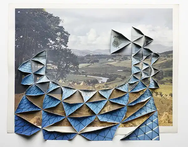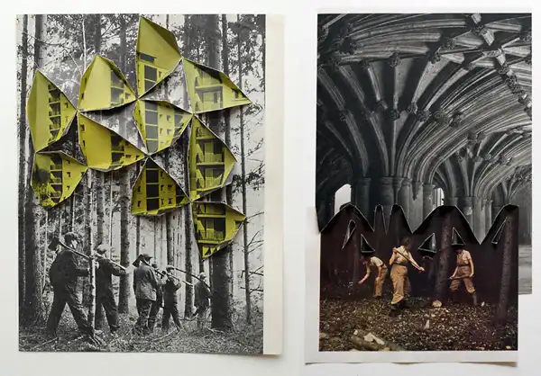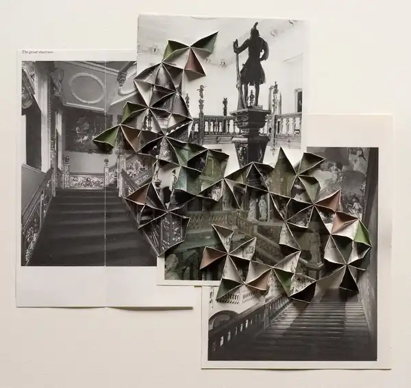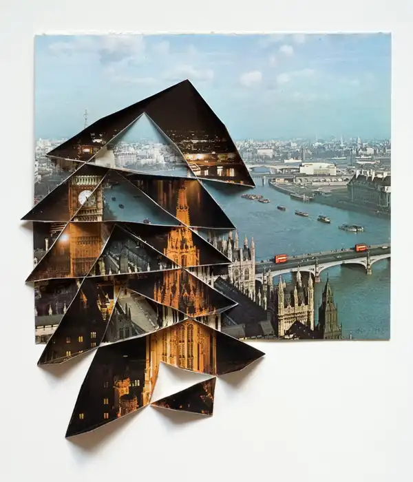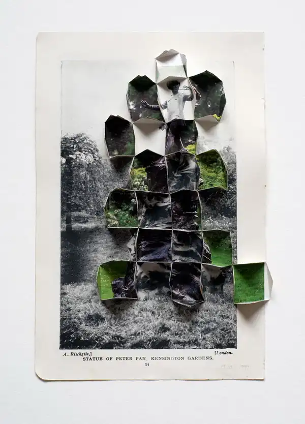 Эбигейл Рейнольдс (Abigail Reynolds) родилась в 1970 году. Живет и работает в Лондоне. Создает оригинальные коллажи из старых атласов, энциклопедий и путеводителей, совмещая фотографии, сделанные в разные времена и напечатанные в разных местах, но на которых изображено одно и то же и примерно с одного и того же ракурса. Верхний слой Эбигейл надрезает и выворачивает наружу, так, что коллаж становится трехмерным.