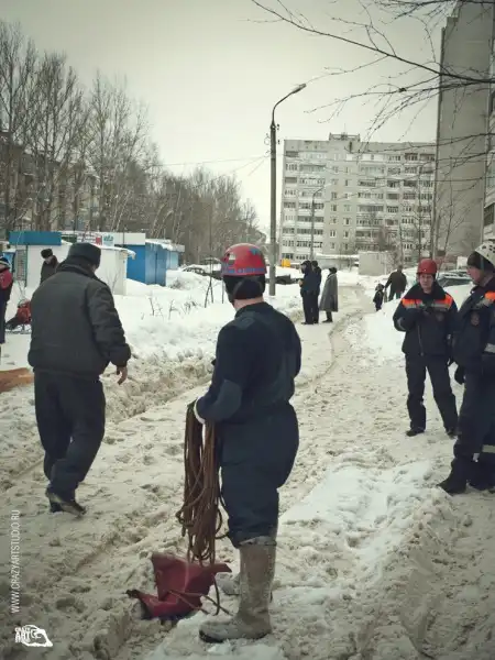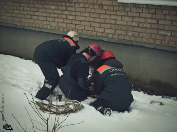 Толпа зевак во главе со спасателями думает над дальнейшей судьбой животного
