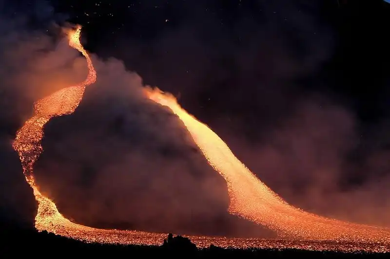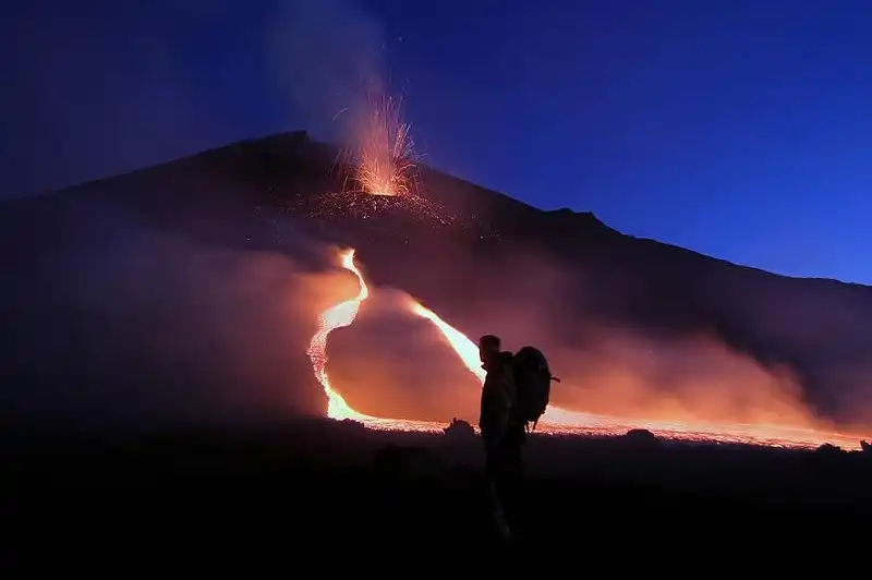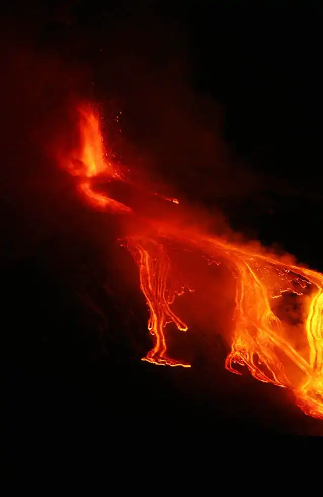 Вулкан Этна, расположенные на острове Сицилия, проснулся. Событие произошло еще 3 января, но если раньше он «спросонья» выбрасывал вулканические «бомбы» (булыжники) и плевался пеплом, то в ночь на четверг жители наблюдали великолепное зрелище: фонтан раскаленной магмы устремляется ввысь, а затем струи лавы и горячего пепла стекающего по склонам.