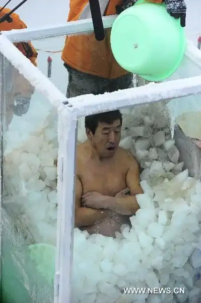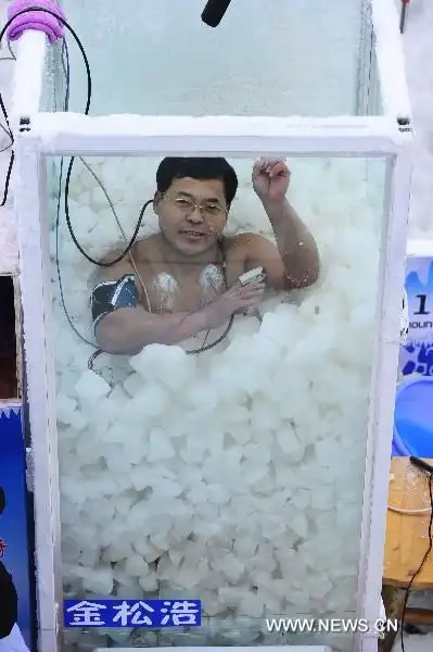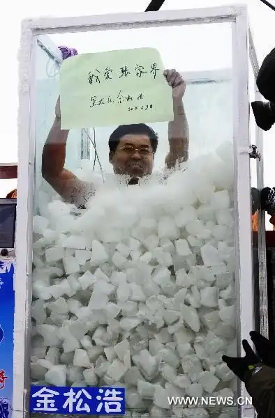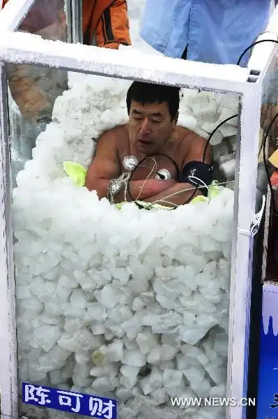 Очередной дебильный китайский конкурс. А смысл конкурса в том, кто дольше просидит в ледяном коробе тот и выиграл...
