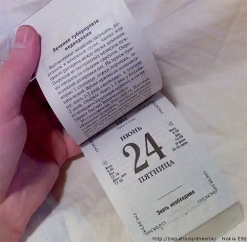Честно говоря, мне всегда нравились отрывные календарики как добрая антикварная идея, но неясно было, как их вешать на стену в городской квартире - гвоздем же не прибьешь. У друзей я тоже ни разу не видел отрывного календаря в действии - только в киосках. Значит, кто-то их покупает? Кто? И вот я захожу недавно в книжный магазин "Молодая гвардия" и вижу чудо: целый стол с широким ассортиментом отрывных календариков на 2011. Все по 20 рублей - подходи и листай. И вот я рассматриваю их, и замечаю, что ассортимент слегка странен. Понятное дело, есть церковный календарь - ну, разные святцы, именины и деяния. Разумеется, есть астрологический - что ждет сегодня Овна, а что Скорпиона. Само собой, есть календарь кулинарный - рецепты и приемы домашнего консервирования. Ну и, конечно, есть юмор - анекдоты. Конечно, бородатые и немного адаптированные - если анекдот казался составителям слишком сложным, они расписывали концовку открытым текстом, чтобы не возникало сомнений, где смеяться. В общем, календарь отрывного юмора тоже на любителя, но придираться не будем. Зато самую большую часть ассортимента занимала целая серия отрывных календарей с поразительными названиями: "Ваше здоровье", "Семейный доктор", "Лечимся сами", "Домашняя нетложка" - и так далее в том же духе. Среди них самым инфернальным оказался отрывной календарь, озаглавленный "2011. В ожидании врача".