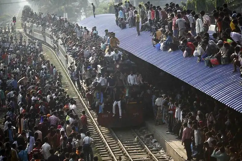 Фотограф «Reuters» Эндрю Бирадж занял третье место в категории «Повседневная жизнь» с фотографией переполненного поезда, подъезжающего к станции в Дакке, 16 ноября. (Andrew Biraj / Reuters)