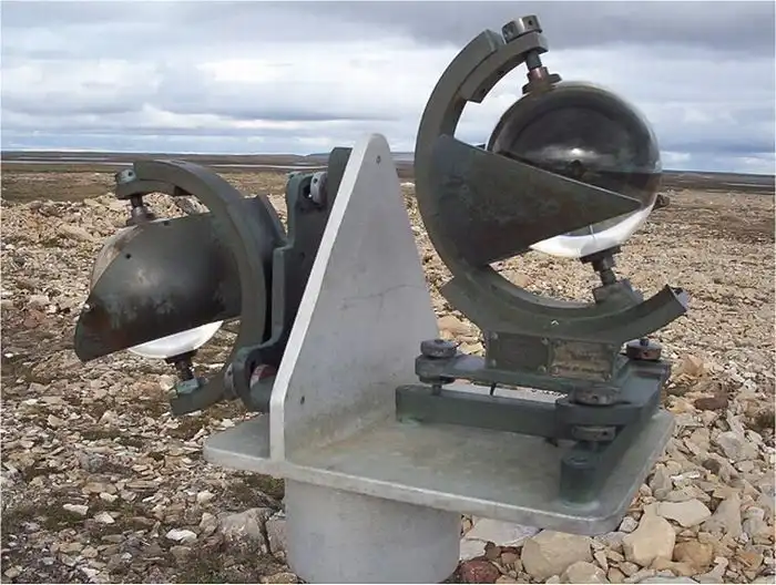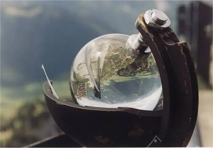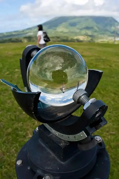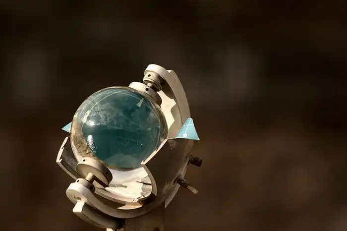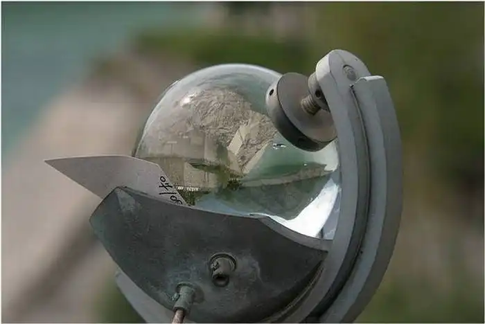В метеорологии применяют очень интересные приборы, которые не каждый видел, возьмем к примеру этот стеклянный шар, с помощью него вычисляют длину солнечного дня и и получают информацию о климате местности. Работает он следующим образом: солнечные лучи проходят через стеклянный шар и за счет преломления, прожигают картон, который помещается под шар. Таким образом видно, как долго светит солнце, и когда оно в зените.