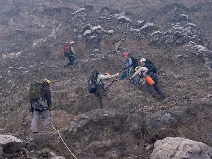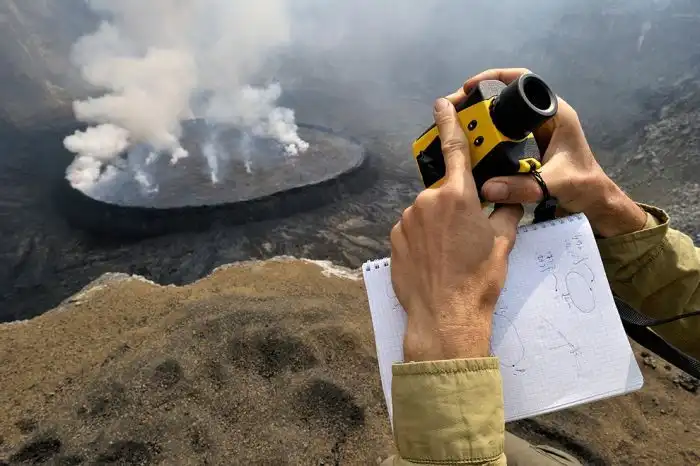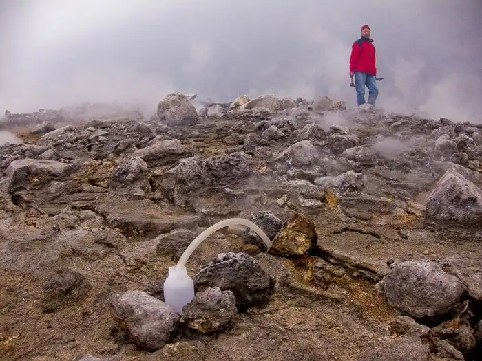 Спускаться к нему опасно без специального снаряжения. Дым и серные испарения могут убить.