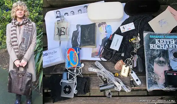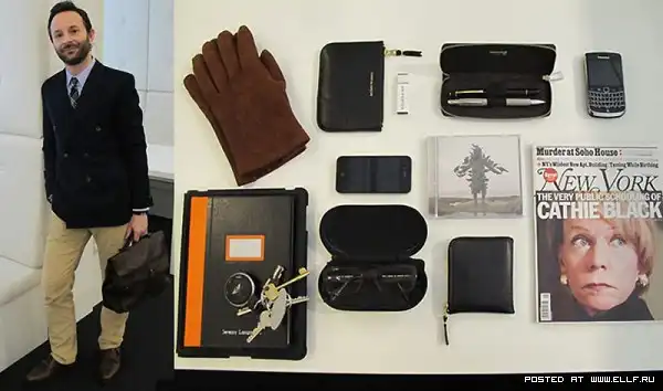 Внутри: замшевые перчатки от «Connolly», бумажник для мелочи от «Comme des Garcons», флэшка, кожаный футляр для ручек от «Alfred Dunhill», ручки «Mont Blanc» и «Porsche», телефон Blackberry, журнал «New York» («Это мой любимый журнал, благодаря ему я узнаю, что творится в штатах»), органайзер «Comme des Garcons», диск «Shearwater Rook» – «чтобы слушать его на полную мощность в машине по пути на работу, чтобы соседи не жаловались», очки от Эндрю Симмонса, ключи от автомобиля, блокнот от «Giuliano Mazzuoli», iPad. (Helen Seamons)