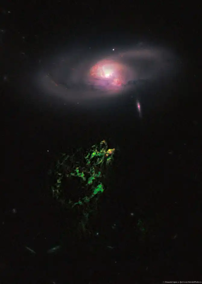 Это призрачное зеленое газовое облако было впервые замечено в 2007 году голландским школьным учителем Ханни ван Аркелем и до сих пор остается загадкой для астрономов. «Воорверт Ханни» («объект Ханни» на голландском языке) – это единственная видимая часть газообразного облака длиной в 300 световых лет, растянувшегося вокруг спиральной галактики IC 2497. На этой фотографии, сделанной «Хабблом» в прошлом месяце, видны скопления молодых звезд (желтого цвета).