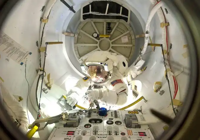 Подготовка к работе. Астронавт Дискавери Элвин Дрю готовится выйти в открытый космос. На фотографии, сделанной 28-го февраля, мы видим часть Международной Космической станции, которая расположена снаружи корабля. Дрю и его напарник Стив Боуэн получили массу разнообразных заданий во время последнего полёта Дискавери к МКС.