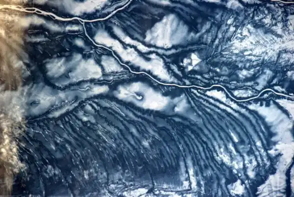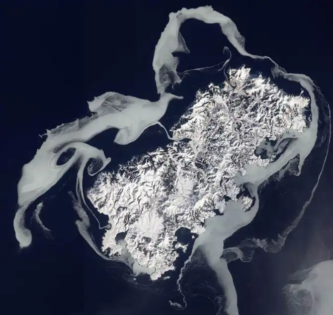 Водовороты льда. Остров Шикотан – это вулканический остров, расположенный на южном краю Курильских островов у берегов Дальнего Востока. Фотография была сделана с борта спутника НАСА, наблюдающего за Землёй, 14-го февраля. На снимке сохранены настоящие цвета. Остров окружён клубящимися потоками серо-голубого ледяного моря.