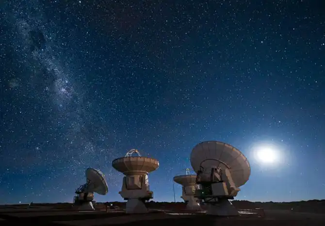 Взгляд в небо. Четыре антенны Европейской Южной Обсерватории, работающие на радиоволнах, с нетерпением ожидают вестей из космоса. На снимке мы также видим Луну, которая освещает нижний правый угол, и Млечный Путь, простирающийся через верхний левый угол фотографии. Этот кадр стал «фотографией недели» ЕЮО 21-го февраля.