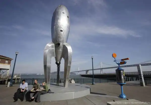 Офисные работники перекусывают перед скульптурой «Raygun Gothic Rocketship» на набережной Эмбаркадеро в Сан-Франциско.